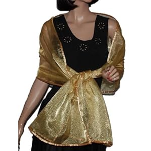 Our Own Design! Sparkling gold crystal organza evening wrap, trimmed in satin; measures 18" x 72". This is perfect for the holidays, weddings or proms! Easy care, machine or hand wash, line dry. NO RETURNS; Please - if an EXACT color match is necessary, shop locally. Made in the USA of imported fabrics.